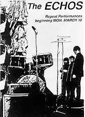 This advert appeared outside of Old Princeton Landing for the first set of shows (18 - 21 March 1996). Subsequent shows appeared to be planned on the spur of the moment, and for some of these events a photocopy of this advert was displayed with the 18 March area whited out and the new date written in its place (here is an an example of this). However, the advert was usually only to be found taped to part of the stage set-up since it didn't take too long before the true identity of 'The Echos' became widely known.