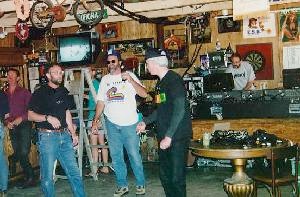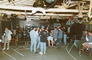 The opposite end of the bar from the stage (pic:Flo). The ladder was used to elevate a cameraman above the crowd. The mixing console can be seen on top of one of the OPL pool tables in the background. Two dartboards are usually on this wall, and have been a point of embarrassment for some that stray across the Canadian border :). The rafters at OPL are stuffed with a lot of assorted items - including a bra of quite staggering proportions.
