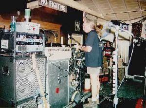Jim Jarmusch sets up for the Big Time video shoot in OPL. Tim 'HandleBars' Mulligan fiddles with the road tour's mixing console in the background. (pic:Richie).